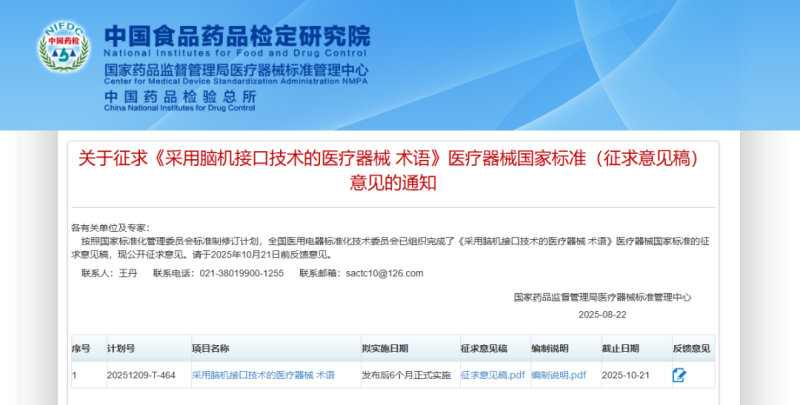 近日,國家藥品監(jiān)督管理局醫(yī)療器械標準管理中心發(fā)布《采用腦機接口技術的醫(yī)療器械 術語》醫(yī)療器械國家標準的征求意見稿,并向社會公開征求意見,同時提到,該標準將于發(fā)布后6個月正式實施。