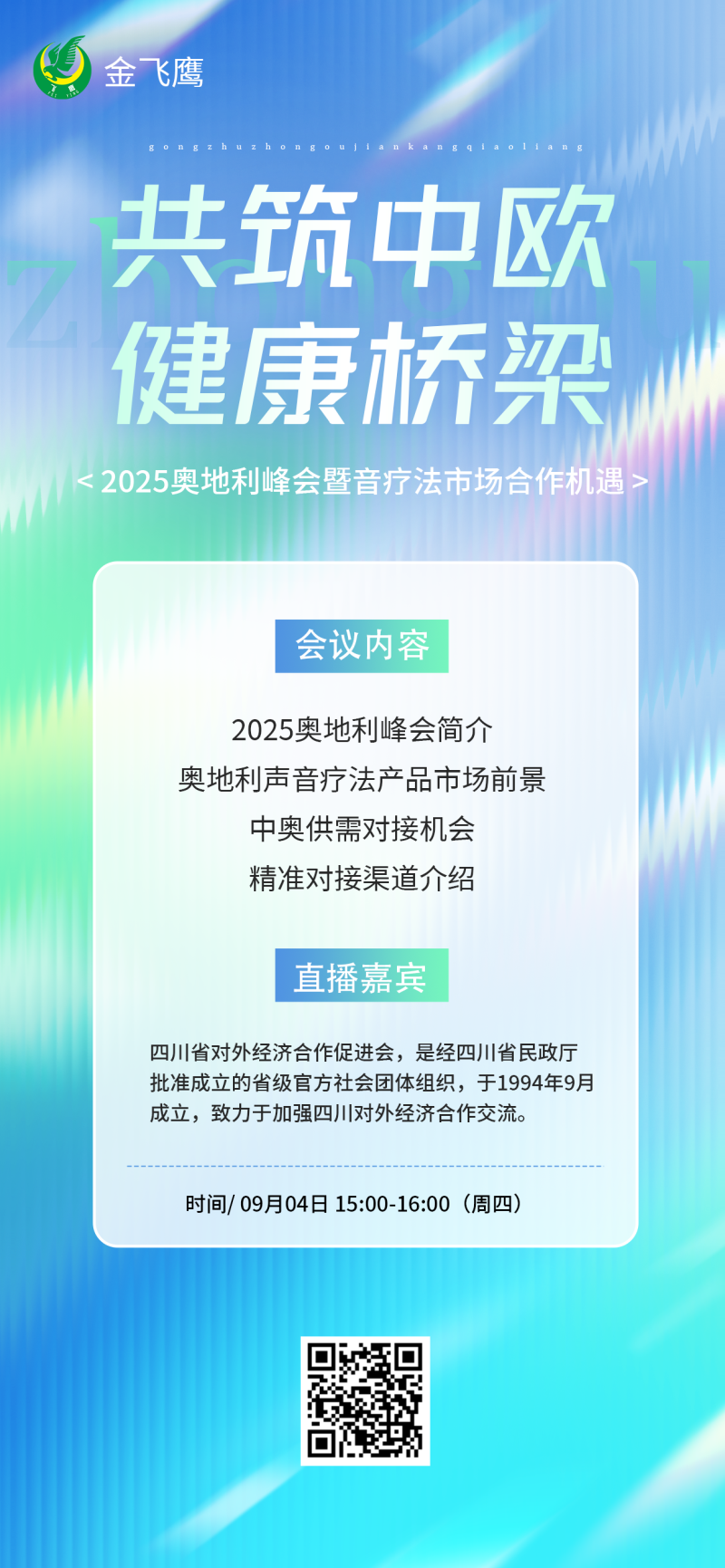 在此背景下,9月4日下午3點(diǎn),我們特別聯(lián)合四川省對(duì)外經(jīng)濟(jì)合作促進(jìn)會(huì),給大家?guī)?/span>第十一屆“全球經(jīng)濟(jì)發(fā)展論壇·奧地利峰會(huì)”暨音療法市場(chǎng)合作機(jī)遇的直播,為您解鎖奧地利市場(chǎng)的財(cái)富密碼!本期直播將從奧地利音療法產(chǎn)品市場(chǎng)前景、中奧供需對(duì)接機(jī)會(huì)及渠道等方面進(jìn)行分享,與各位共拓奧地利的掘金版圖,感興趣的朋友記得提前預(yù)約!