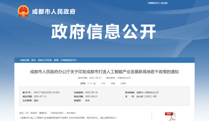 近日,成都市人民政府發(fā)布《成都市打造人工智能產(chǎn)業(yè)發(fā)展新高地若干政策》(以下簡(jiǎn)稱《若干政策》),以深化建設(shè)國(guó)家新一代人工智能創(chuàng)新發(fā)展試驗(yàn)區(qū)和國(guó)家人工智能創(chuàng)新應(yīng)用先導(dǎo)區(qū),夯實(shí)人工智能要素、深化場(chǎng)景應(yīng)用、營(yíng)造良好生態(tài)、提升行業(yè)影響,打造全國(guó)人工智能產(chǎn)業(yè)發(fā)展新高地。